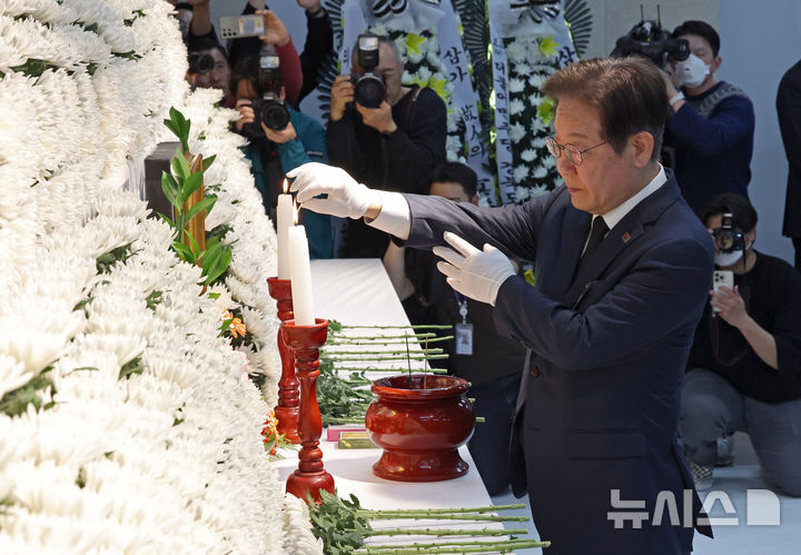 [의성=뉴시스] 김금보 기자 = 이재명 더불어민주당 대표가 27일 경북 의성군 의성군청소년문화의집에 마련된 '의성 산불 진화헬기 추락'으로 순직한 고 박현우 기장의 빈소를 찾아 분향하고 있다. 2025.03.27. [email protected]