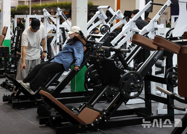 [서울=뉴시스] 이영환 기자 = 27일 오후 서울 강남구 코엑스에서 열린 2025 서울국제스포츠레저산업전(SPOEX)에서 한 관람객이 피트니스 기구 체험을 하고 있다. 2025.03.27. [email protected]