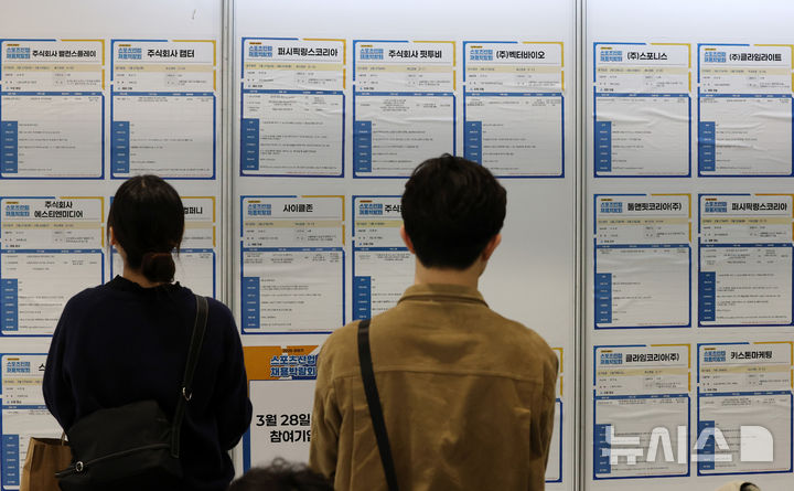[서울=뉴시스] 이영환 기자 = 27일 오후 서울 강남구 코엑스에서 열린 2025 서울국제스포츠레저산업전(SPOEX)에서 진행된 스포츠산업 채용박람회에서 구직자들이 채용공고를 살펴보고 있다. 2025.03.27. [email protected]