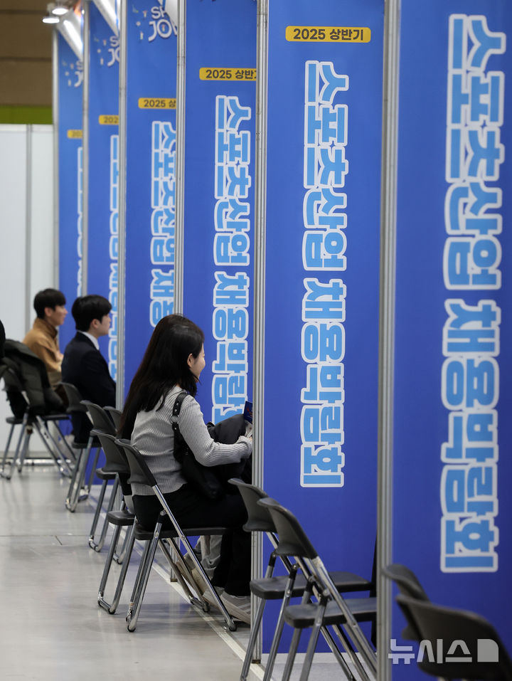 [서울=뉴시스] 이영환 기자 = 27일 오후 서울 강남구 코엑스에서 열린 2025 서울국제스포츠레저산업전(SPOEX)에서 진행된 스포츠산업 채용박람회에서 구직자들이 상담을 받고 있다. 2025.03.27. [email protected]