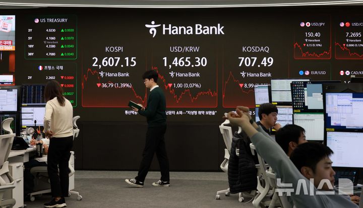 [서울=뉴시스] 고범준 기자 = 트럼프발 관세전쟁의 전선이 확대되면서 코스피와 코스닥 모두 하락 마감했다. 이날 코스피는 전 거래일(2643.94)보다 36.79포인트(1.39%) 하락한 2607.15에 장을 마감한 27일 오후 서울 중구 하나은행 딜링룸 전광판에 지수가 표시되고 있다.