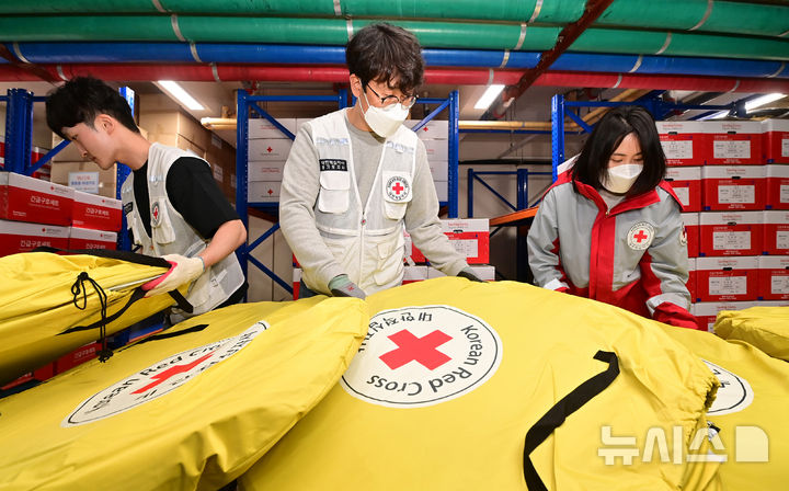 [수원=뉴시스] 김종택 기자 = 대한적십자사 경기도지사 직원들이 27일 경기도 수원시 권선구 남중부봉사관 구호창고에서 산불 피해 지역인 경북 영덕군에 지원할 재난구호 텐트 등 긴급 구호물품을 옮기고 있다. (사진=중부일보 제공) 2025.03.27. [email protected]