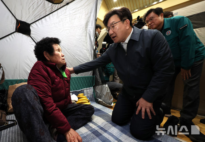 [청송=뉴시스] 이무열 기자 = 권성동 국민의힘 원내대표가 27일 경북 청송군 진보문화체육센터에 마련된 산불 대피소에서 주민들을 격려하고 있다. 2025.03.27. [email protected]