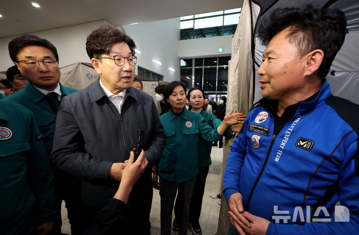 [청송=뉴시스] 이무열 기자 = 권성동 국민의힘 원내대표가 27일 경북 청송군 진보문화체육센터에 마련된 산불 대피소에서 주민들을 격려하고 있다. 2025.03.27. [email protected]