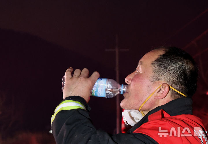 [안동=뉴시스] 김금보 기자 = 산림청 산불 진화 대원들이 27일 경북 안동시 일직면 원호리 일대 야산 화선 저지에 성공한 뒤 휴식을 취하고 있다. 2025.03.27. [email protected]