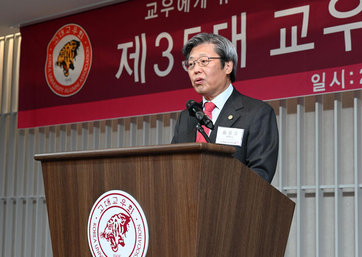[서울=뉴시스] 김근수 기자 = 제35대 고려대학교 교우회장에 취임한 승명호 동화그룹·한국일보 회장이 27일 서울 성북구 고려대 교우회관 안암홀에서 제35대 교우회장 수락연설을 하고 있다. (사진= 고려대 교우회 제공) 2025.03.27. [email protected] *재판매 및 DB 금지