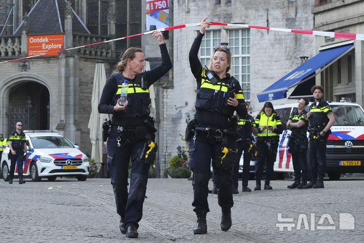 [암스테르담=AP/뉴시스] 27일(현지 시간) 네덜란드 암스테르담 담 광장 인근에서 흉기 난동이 발생해 경찰이 현장 주변에 모여 있다. 현지 경찰은 한 남성이 흉기 난동을 벌여 미국인 2명 등 5명이 다쳤으며 용의자는 체포됐다고 밝혔다. 2025.03.28.