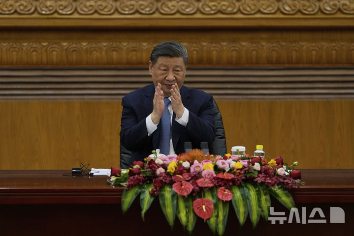 [베이징=AP/뉴시스] 시진핑 중국 국가주석이 28일(현지 시간) 중국 베이징 인민대회당에서 열린 국제공상계 대표 회견에 참석해 박수를 치고 있다. 이날 행사에는 이재용 삼성전자 회장을 비롯해 글로벌기업 최고경영자(CEO) 30여 명이 참석했다. 2025.03.28.