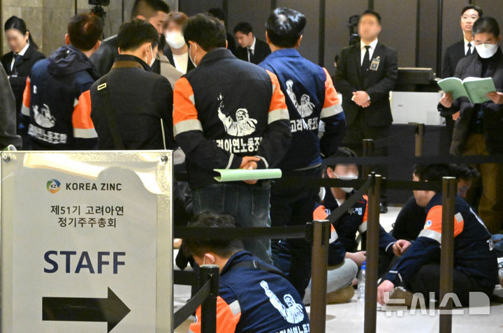 [서울=뉴시스] 고범준 기자 = 28일 오전 서울 용산구 몬드리안 호텔에서 열린 정기 제51기 고려아연 정기주주총회에서 주주들이 입장을 기다리고 있다. (공동취재) 2025.03.28. [email protected]