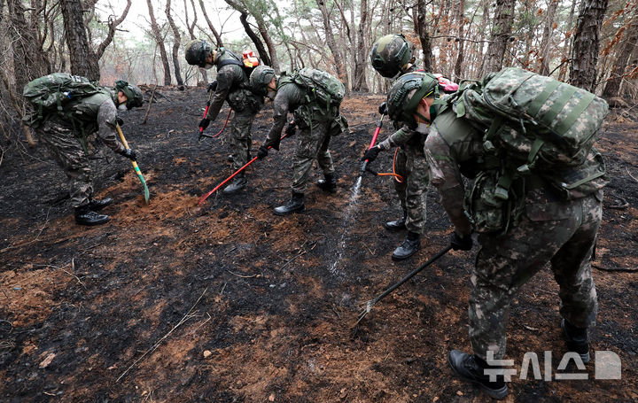 [의성=뉴시스] 이무열 기자 = 28일 경북 의성군 단촌면 방하리 산불 현장에 50사단과 2신속대응사단 장병들이 잔불 진화 지원작전에 나서고 있다. 2025.03.28. [email protected]