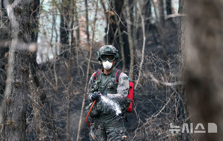 [의성=뉴시스] 이무열 기자 = 28일 경북 의성군 단촌면 방하리 산불 현장에 50사단과 2신속대응사단 장병들이 잔불 진화 지원작전에 나서고 있다. 2025.03.28. [email protected]