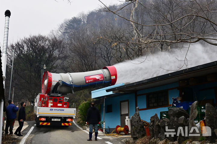 [산청=뉴시스] 차용현 기자 = 경남 산청 산불 발생 8일째를 맞은 28일 오전 경남도가 삼장면 대포리 일원에서 살수차를 이용해 물을 뿌리고 있다. 2025.03.27. [email protected]
