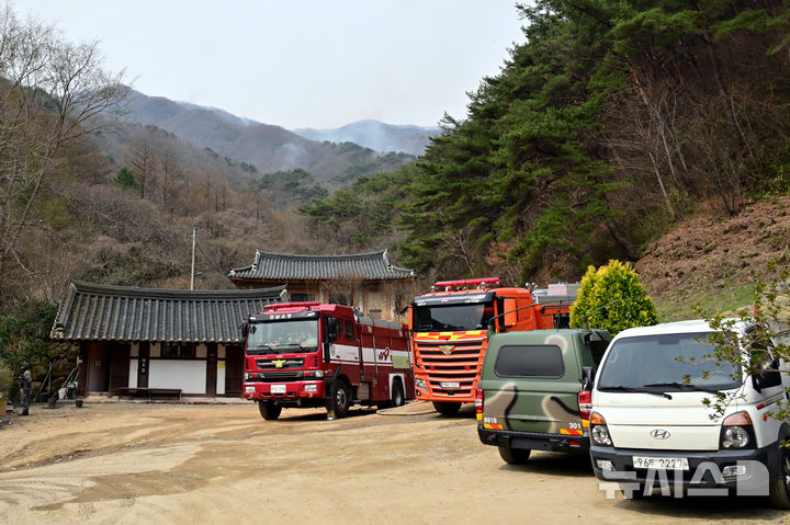 [산청=뉴시스] 차용현 기자 = 경남 산청 산불 발생 8일째를 맞은 28일 오전 소방당국이 삼장면 대포리 덕산사에서 산불 저지선을 구축하고 있다. 2025.03.27. [email protected]
