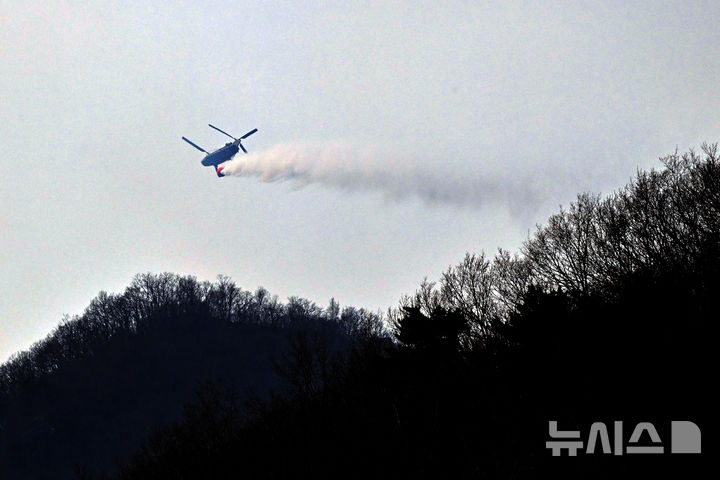 [산청=뉴시스] 차용현 기자 = 경남 산청 산불 발생 8일째를 맞은 28일 오전 군용헬기가 삼장면 대포리 일원에서 진화작업을 펼리고 있다. 2025.03.27. [email protected]