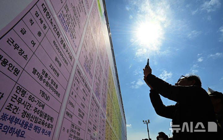 [수원=뉴시스] 김종택 기자 = 28일 경기도 수원시 팔달구 화성행궁 광장에서 열린 '노인일자리 채용한마당'을 찾은 어르신들이 채용정보 게시판을 살펴보고 있다. 2025.03.28. [email protected]