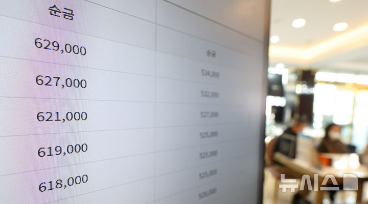 [서울=뉴시스] 추상철 기자 = 금값이 사상 최고치를 경신한 28일 오후 서울 종로구 한국금거래소 모니터에 순금 살 때 가격과 팔 때 가격이 게시돼 있다.