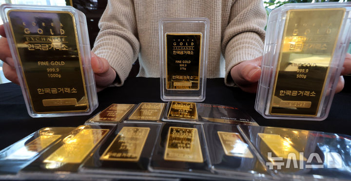 [서울=뉴시스] 추상철 기자 = 금값이 사상 최고치를 경신한 28일 오후 서울 종로구 한국금거래소에서 직원이 골드바를 정리하고 있다.
