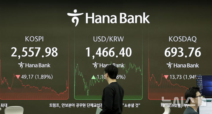 [서울=뉴시스] 최동준 기자 = 코스피가 전 거래일보다 49.17포인트(1.89%) 하락한 2557.98로 장을 마친 28일 서울 중구 하나은행 딜링룸에서 딜러들이 업무를 보고 있다.