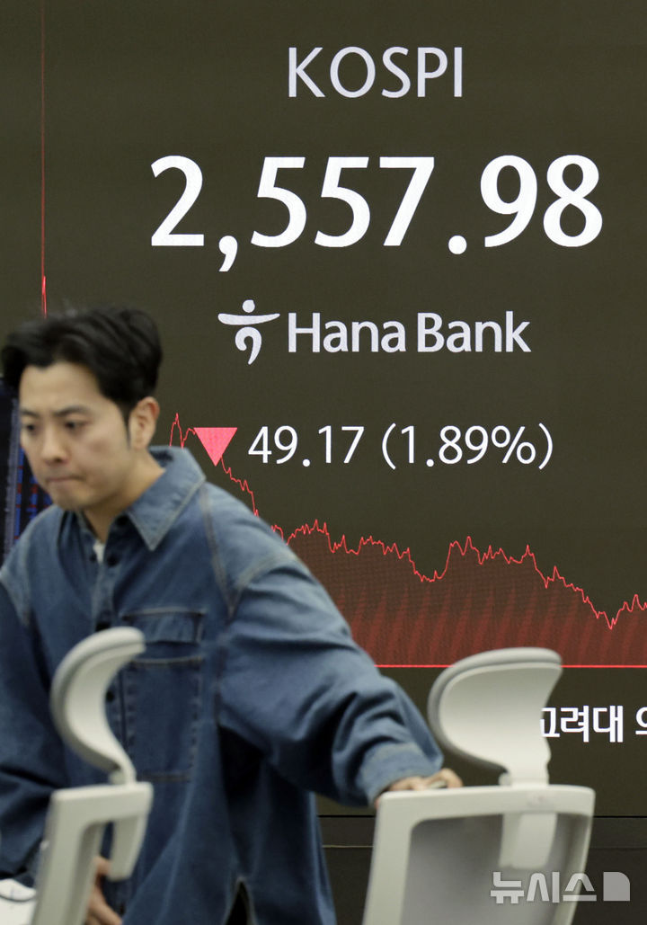 [서울=뉴시스] 최동준 기자 = 코스피가 전 거래일보다 49.17포인트(1.89%) 하락한 2557.98로 장을 마친 28일 서울 중구 하나은행 딜링룸에서 딜러들이 업무를 보고 있다. 2025.03.28. [email protected]