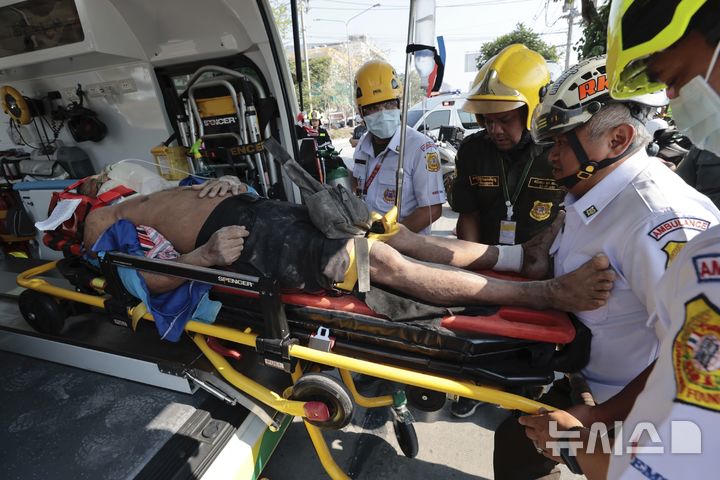 [방콕=AP/뉴시스] 28일(현지 시간) 태국 방콕에서 지진으로 건설 중 무너진 고층 건물 현장에서 구조대가 부상자를 들것에 실어 구급차에 태우고 있다. 이날 미얀마 만달레이에서 규모 7.7의 강진이 발생해 인접국인 태국 방콕에서 건설 중이던 30층 건물이 무너져 최소 10명이 숨지고 약 100명이 매몰된 것으로 알려졌다. 2025.03.29.