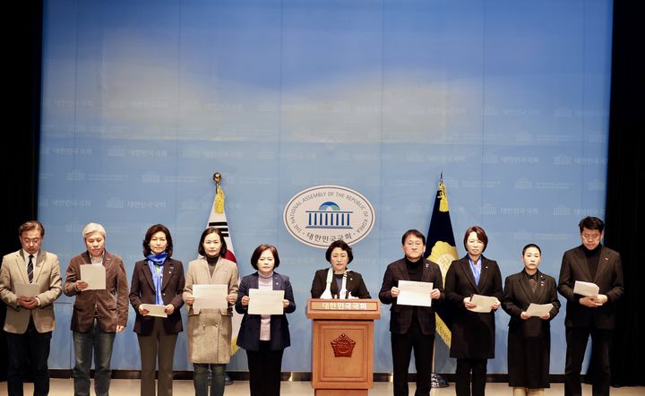 [서울=뉴시스] 조성봉 기자 = 김선민 조국혁신당 대표 권한대행을 비롯한 의원들이 29일 서울 여의도 국회 소통관에서 한덕수 대통령 권한대행 국무총리 탄핵 추진 방침을 밝히는 기자회견을 하고 있다. (사진=조국혁신당 제공)2025.03.29. [email protected]