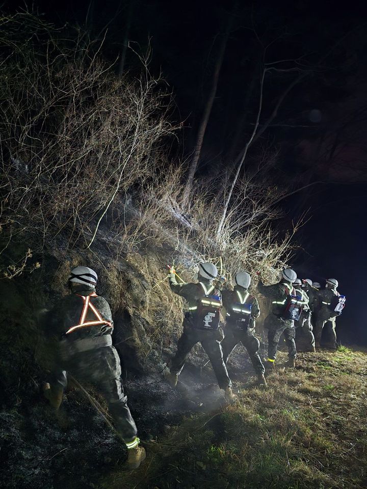 [서울=뉴시스] 정병혁 기자 = 경남 산청군 산불 현장에서 육군 39사단 장병이 야간 산불진화 지원작전을 펼치며 마지막 불씨정리에 최선을 다하고 있다.(사진=육군 제공) 2025.03.29. [email protected] *재판매 및 DB 금지