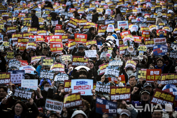 [서울=뉴시스] 정병혁 기자 = 29일 서울 종로구 동십자각에서 열린 윤석열 즉각 퇴진 사회대개혁 17차 범시민대행진에서 참가자들이 구호를 외치고 있다. 2025.03.29. [email protected]