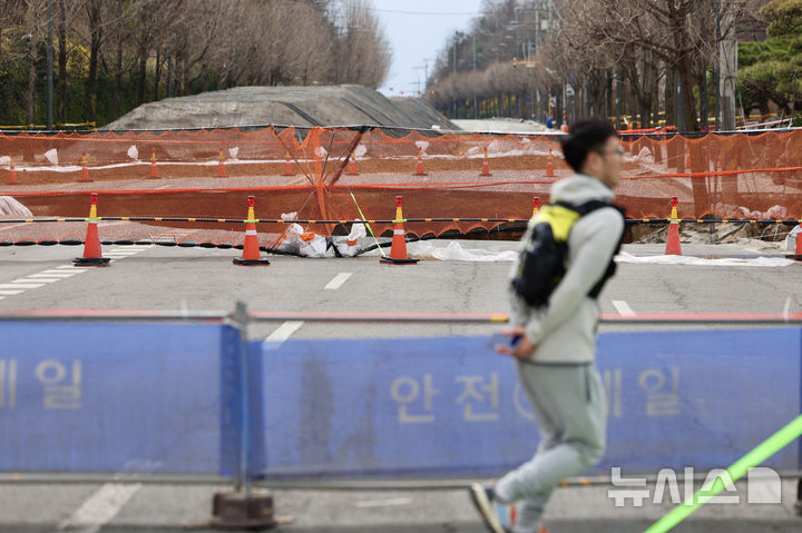 [서울=뉴시스] 김명년 기자 = 국토교통부는 지난 24일 명일동에서 발생한 대형 지반침하 사고 원인을 규명하기 위해 중앙지하사고조사위원회(사조위)를 구성운영한다. 국토부는 위원단에서 지반침하 사고와 관련된 토질 및 기초 터널지하안전 분야 등 전문가를 12명 추려 사조위를 구성하고 오는 31일부터 5월30일까지 2개월간 조사를 실시할 계획이다. 사진은 30일 오후 서울 강동구 명일동 지반침하(싱크홀) 사고 현장 모습. 2025.03.30. [email protected]
