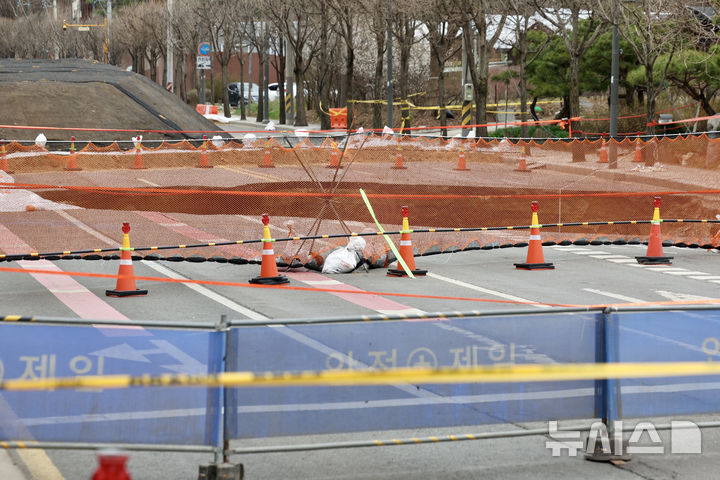 [서울=뉴시스] 김명년 기자 = 국토교통부는 지난 24일 명일동에서 발생한 대형 지반침하 사고 원인을 규명하기 위해 중앙지하사고조사위원회(사조위)를 구성운영한다. 국토부는 위원단에서 지반침하 사고와 관련된 토질 및 기초 터널지하안전 분야 등 전문가를 12명 추려 사조위를 구성하고 오는 31일부터 5월30일까지 2개월간 조사를 실시할 계획이다. 사진은 30일 오후 서울 강동구 명일동 지반침하(싱크홀) 사고 현장 모습. 2025.03.30. [email protected]