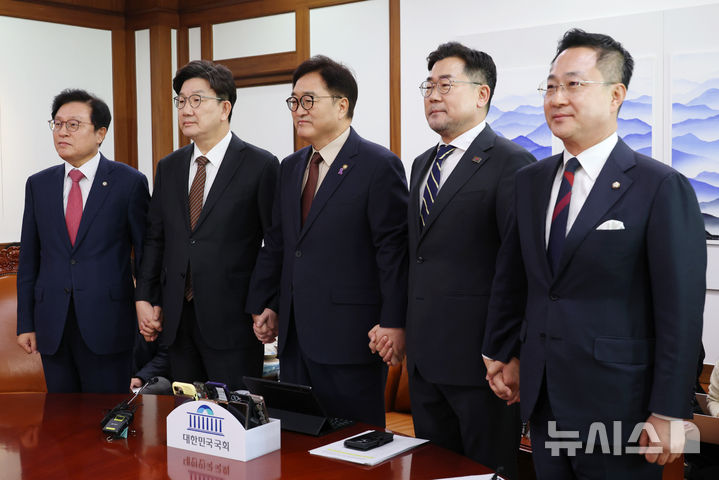 [서울=뉴시스] 고승민 기자 = 우원식 국회의장과 권성동 국민의힘 원내대표, 박찬대 더불어민주당 원내대표가 31일 오전 서울 여의도 국회에서 회동하며 기념촬영을 하고 있다.