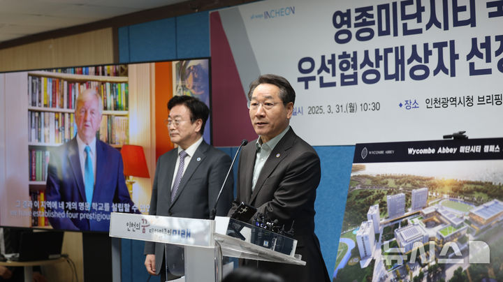 [인천=뉴시스] 전진환 기자 = 유정복 인천시장이 31일 오전 인천 남동구 인천시청에서 영종미단시티 국제학교 우선협상대상자 선정 결과를 발표하고 있다. 인천시는 국제학교 우선협상대상자로 영국의 기숙학교 '위컴 애비'(Wycombe Abbey)를 선정했다고 밝혔다.  2025.03.31. [email protected]