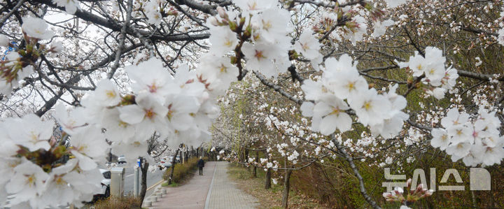 [전주=뉴시스] 김얼 기자 = 완연한 봄 날씨가 이어지고 있는 31일 전북 전주시 조경단로에 벚꽃이 꽃망울을 터트리며 개화하고 있다. 2025.03.31. [email protected]