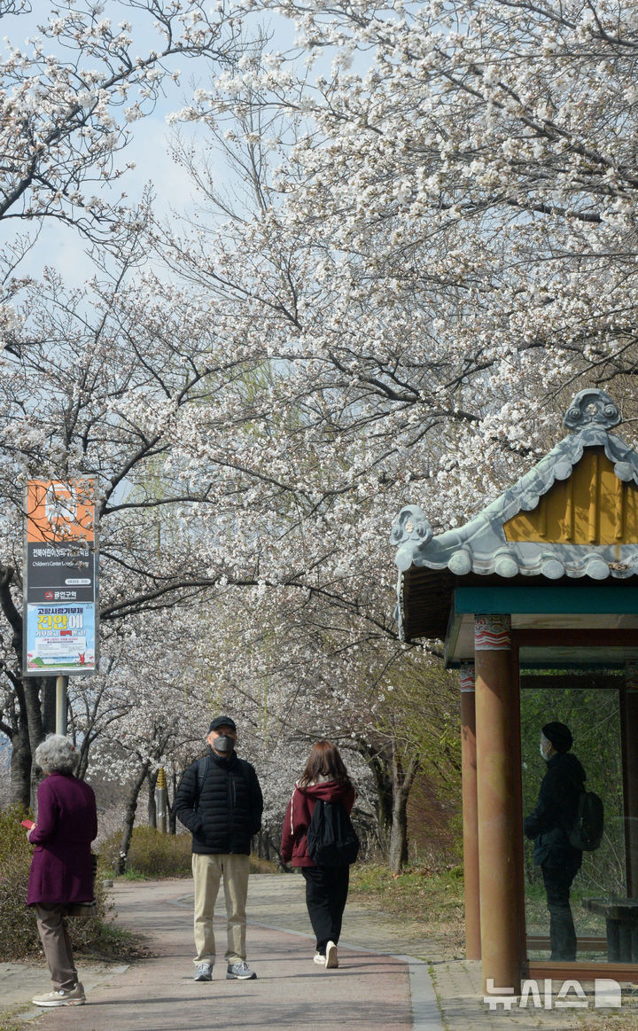 [전주=뉴시스] 김얼 기자 = 완연한 봄 날씨가 이어지고 있는 31일 전북 전주시 조경단로에 벚꽃이 꽃망울을 터트리며 개화하고 있다. 2025.03.31. [email protected]