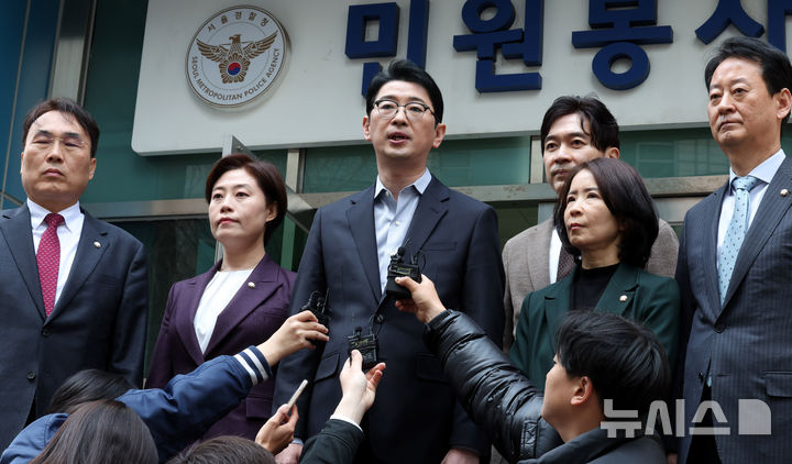 [서울=뉴시스] 추상철 기자 = 주진우 국민의힘 법률자문위원장이 31일 오후 서울 종로구 서울경찰청 앞에서 이재명 더불어민주당 대표, 방송인 김어준씨 등 72인에 대한 '내란음모(예비적: 내란선전·선동) 혐의 형사 고발장'을 접수 한 후 기자회견을 하고 있다. 2025.03.31. [email protected]