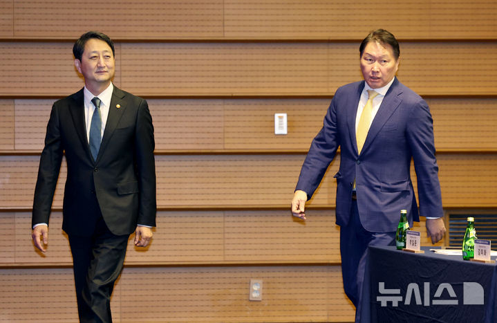 [서울=뉴시스] 김진아 기자 = 안덕근(왼쪽) 산업통상자원부 장관과 최태원 대한상의 회장이 31일 서울 중구 대한상공회의소에서 열린 '제7회 탄소중립과 에너지 정책 세미나'에 참석하고 있다. 2025.03.31. [email protected]