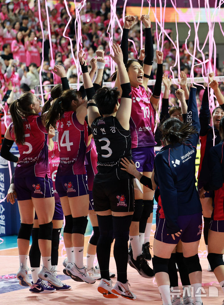 [인천=뉴시스] 고범준 기자 = 31일 인천 부평구 삼산월드체육관에서 열린 2024~2025 V-리그 여자부 챔피언결정전(5전 3선승제) 1차전 흥국생명 핑크스파이더스와 정관장 레드스파크스의 경기, 세트스코어 3-0으로 승리를 거둔 흥국생명 김연경과 선수들이 기뻐하고 있다. 2025.03.31. [email protected]