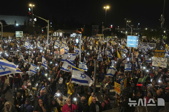 [예루살렘=AP/뉴시스] 지난달 31일(현지 시간) 예루살렘에 있는 이스라엘 의회 크네세트 앞에서 베냐민 네타냐후 총리 정부에 반대하는 시위가 벌어지고 있다. 시위대는 네타냐후 총리가 본인의 비리 의혹을 감추려 전쟁을 확대하고 있다고 주장하고 있다. 2025.04.01.