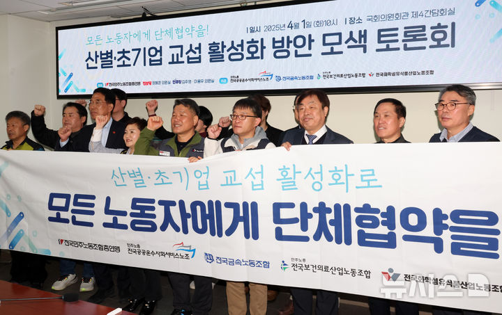 [서울=뉴시스] 조성우 기자 = 김주영(왼쪽 세 번째) 더불어민주당 의원과 홍지욱 민주노총 부위원장 등 참석자들이 1일 오전 서울 여의도 국회 의원회관에서 열린 산별·초기업 교섭 활성화 방안 모색 토론회에서 '모든 노동자에게 단체협약을!'이라고 적힌 현수막을 들고 기념촬영을 하고 있다. 2025.04.01. [email protected]