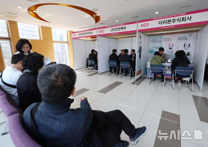 [서울=뉴시스] 이영환 기자 = 1일 오전 서울 양천구 해누리타운에서 열린 2025 양천구 취업박람회에서 구직자들이 현장 면접을 보고 있다. 2025.04.01. [email protected]