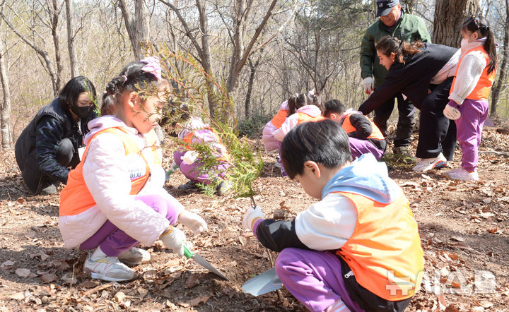 [울산=뉴시스] 배병수 기자 = 1일 오전 울산 동구 염포산 일원에서 열린 제80회 식목일 나무심기 행사에서 동구 환희지유치원 원생들이 나무를 심고 있다. [email protected].