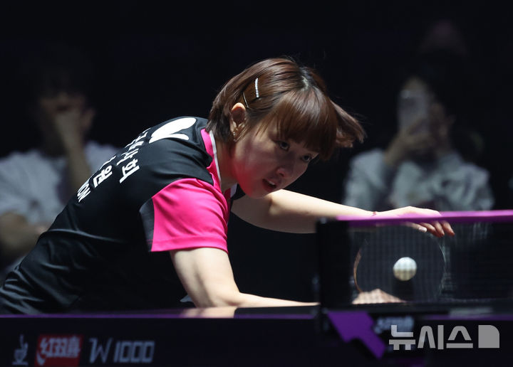 [인천=뉴시스] 전진환 기자 = 1일 인천 중구 인스파이어 아레나에서 열린 WTT(월드테이블테니스) 챔피언스 인천 2025 대회 32강경기에서 서효원(대한민국)이 주위링(마카오)을 상대로 경기를 펼치고 있다. 2025.04.01. [email protected]