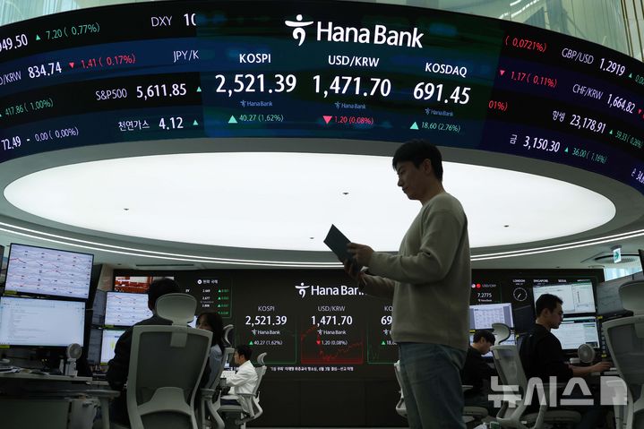 [서울=뉴시스] 고범준 기자 = 코스피가 전 거래일(2481.12)보다 40.27포인트(1.62%) 오른 2521.39에 장을 마감한 1일 오후 서울 중구 하나은행 딜링룸 전광판에 지수가 표시되고 있다.