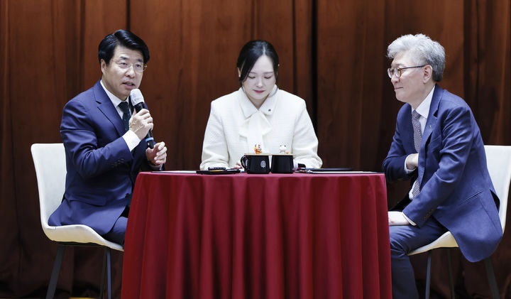 [서울=뉴시스] 추상철 기자 = 서강석(왼쪽) 송파구청장이 1일 오전 서울 송파구청 대강당에서 열린 직원 정례 조례 보고회에서 열린 ‘구청장과 직원의 톡톡 한마당’에서 질문에 답변하고 있다. (사진= 송파구 제공) 2025.04.01. [email protected] *재판매 및 DB 금지