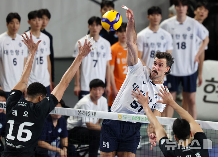 [천안=뉴시스] 김명년 기자 = 1일 오후 충남 천안시 유관순체육관에서 열린 2024-2025 V-리그 남자부 챔피언결정전 1차전 현대캐피탈과 대한항공의 경기, 대한항공 러셀이 공격하고 있다. 2025.04.01. [email protected]