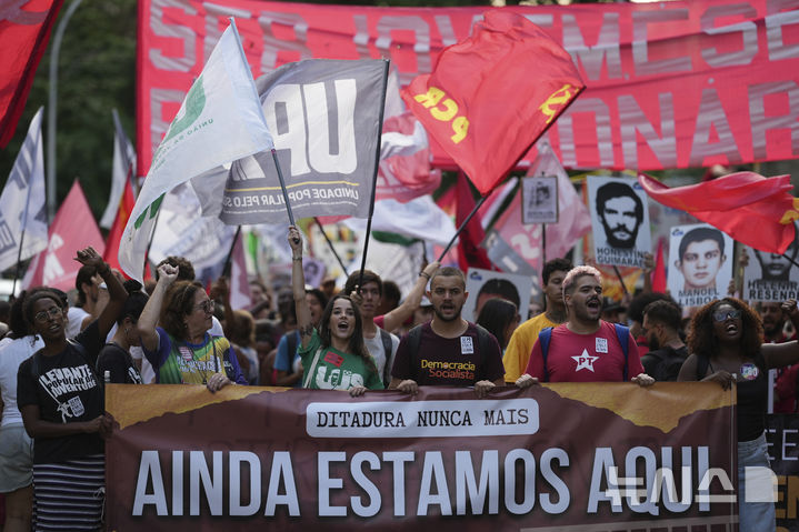 [리우데자네이루=AP/뉴시스] 1일(현지 시간) 브라질 리우데자네이루에서 군사 쿠데타 발발 61주년을 맞아 시위대가 군사 독재 정권 당시 희생자들의 사진과 각종 깃발을 들고 행진하고 있다. 브라질에서 1964년 3월 31일 미국의 지원을 받아 군사 쿠데타가 발생했고 이후 25년 동안 군부 독재가 이어졌다. 2025.04.02.