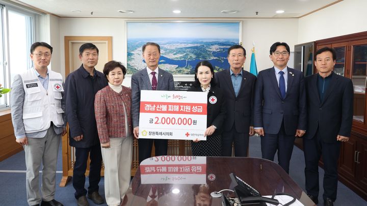 [창원=뉴시스] 강경국 기자 = 손태화 경남 창원시의회 의장이 2일 산청지역 산불 피해복구와 이재민 구호활동 지원에 써달라며 성금 200만원을 박희순 적십자사 경남지사 회장에게 전달하고 있다. (사진=창원시의회 제공). 2025.04.02. [email protected]