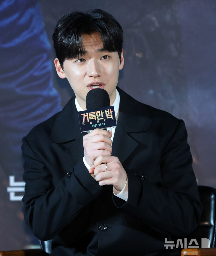 [서울=뉴시스] 김혜진 기자 = 배우 이다윗이 2일 오전 서울 광진구 롯데시네마 건대입구에서 열린 영화 '거룩한 밤: 데몬 헌터스' 제작보고회에서 인사말을 하고 있다.