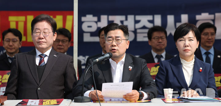 [서울=뉴시스] 김진아 기자 = 박찬대 더불어민주당 원내대표가 2일 서울 종로구 광화문에 마련된 천막당사에서 열린 최고위원회의에서 발언하고 있다. 2025.04.02. [email protected]