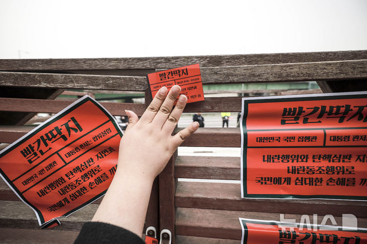 [서울=뉴시스] 정병혁 기자 = 2일 서울 용산구 한남동 대통령 관저 인근에서 열린 내란수괴 윤석열 파면버스 기자회견에서 참가자들이 가압류 스티커를 붙이는 퍼포먼스를 하고 있다. 2025.04.02. [email protected]