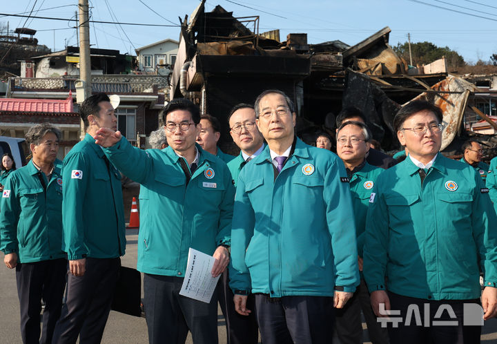 [영덕=뉴시스] 조수정 기자 = 한덕수 대통령 권한대행 국무총리가 2일 경북 영덕군 노물리 산불피해 현장을 찾아 김광열 영덕군수로부터 설명을 들으며 현장을 살피고 있다. 2025.04.02. [email protected]